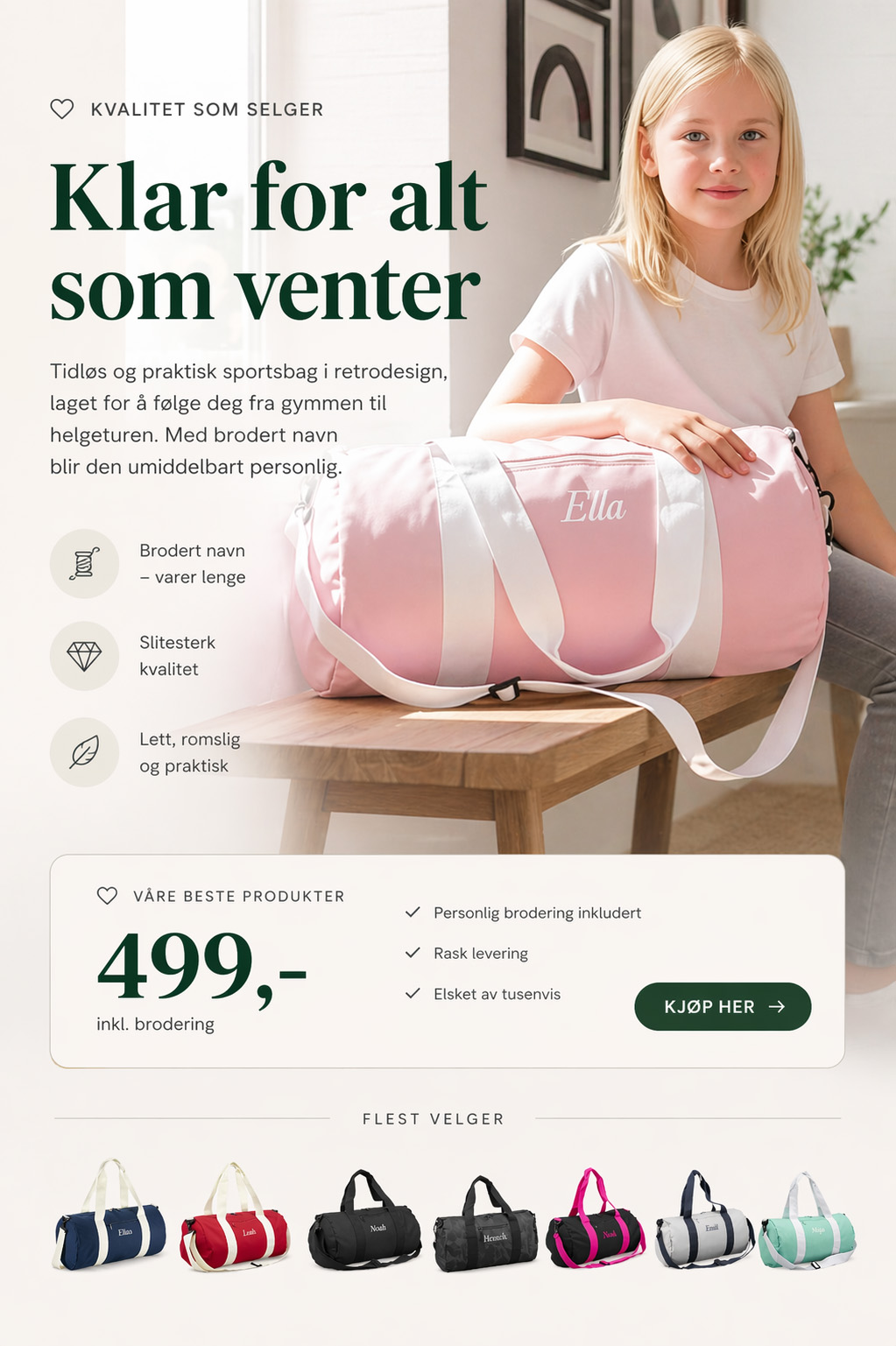 Praktiske toalettvesker, slitesterke gymposer og myke bade- og strandhåndklær, alle med navn inkludert.